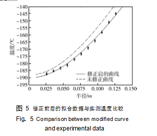 對(duì)液氮罐內(nèi)溫度的初步擬合表明,溫度的計(jì)算結(jié)果與實(shí)測數(shù)值間存在一定誤差,鑒于溫度測量所用的鉑電阻探頭的感溫段長度有 22. 0 mm 長,要測的是空間點(diǎn)的溫度,而實(shí)際的溫度是該長度上的平均溫度。因此,考慮溫度在這段長度上的變化,取這段鉑電阻的中點(diǎn)的溫度作為實(shí)測點(diǎn)的溫度,從而對(duì)計(jì)算結(jié)果進(jìn)行修正。修正后典型的擬合溫度如圖 5 所示,修正的結(jié)果減小了擬合與實(shí)測溫度值之間的誤差,提高了擬合的精度。這也可從圖 4 中的結(jié)果得到驗(yàn)證,軸向溫度的實(shí)測值與理論計(jì)算得到的結(jié)果兩者符合得