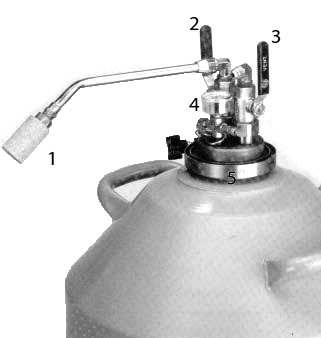 使用液體抽取裝置液氮罐。1)低溫相分離器(確實(shí),他們稱(chēng)其為“以后”)。2)液體閥。3)排氣閥。4)壓力表和安全泄壓閥。5)夾緊帶。
